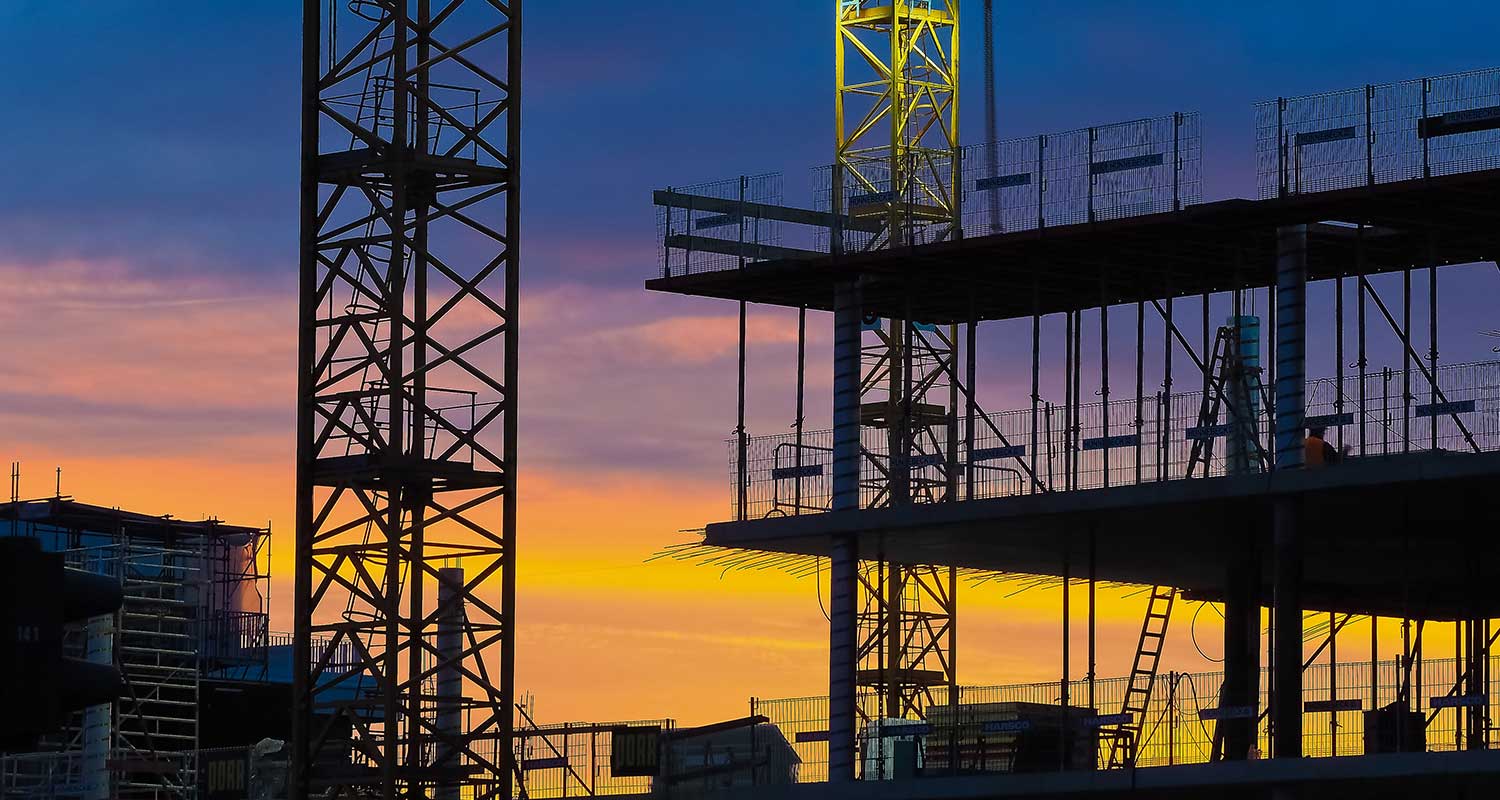 Finished Apartment Building and a New High-Rise Building Construction Site with Yellow Cranes against Blue Sky. Real Estate, Residential Buildings Urban Mixed-Use Development Concept.